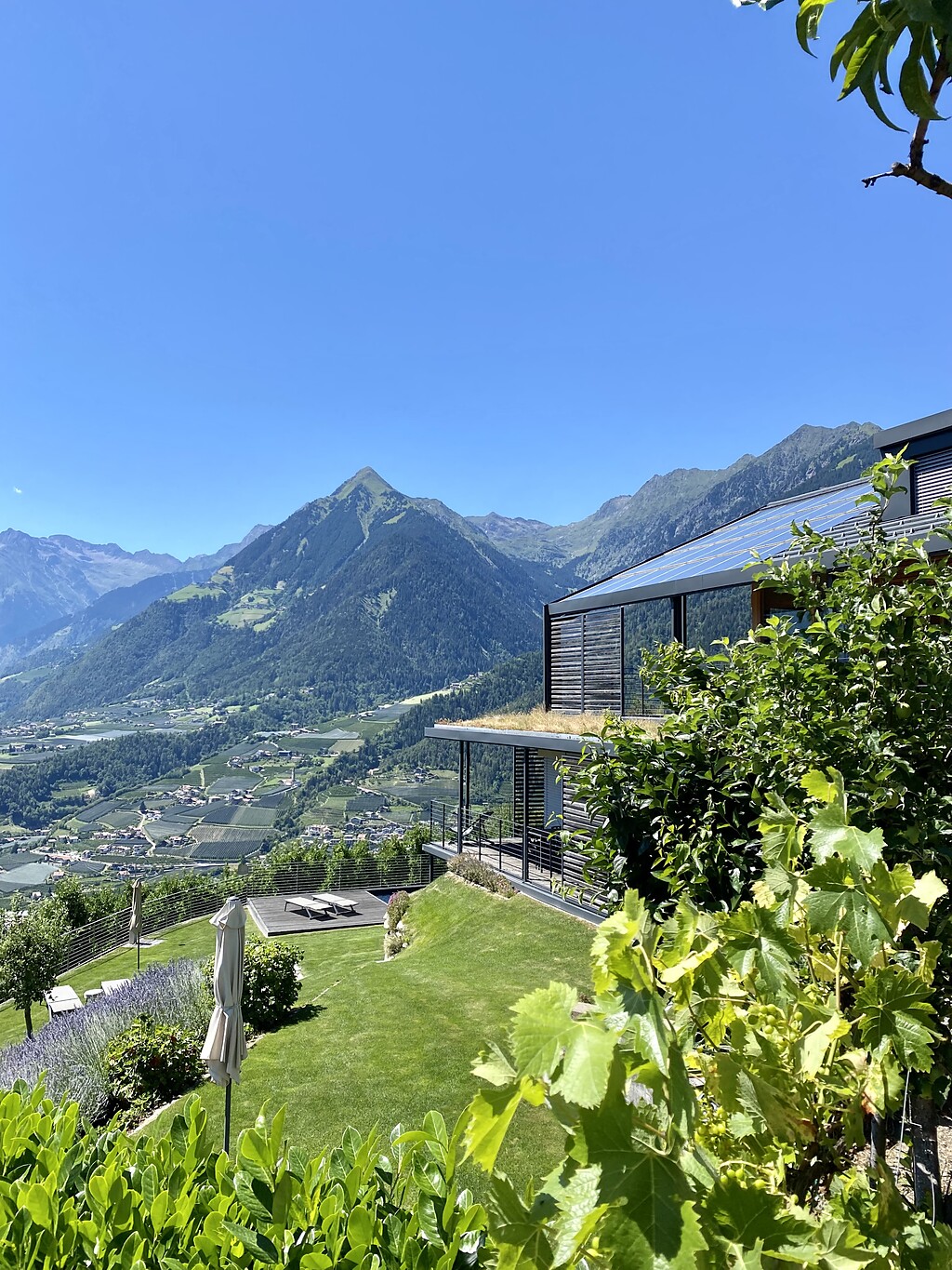 Die Dahoam Naturresidence ist ein Beispiel für anspruchsvolle und nachhaltige Architektur im Einklang mit der umliegenden Landschaft. Diese ist auch wirklich beeindruckend, genauso wie der Blick auf die stolze Bergkulisse und den Meraner Talkessel.