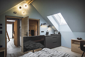 Combination of apartments 3 and 4 on second floor with combined entrance door, one apartment with king-size double bed and skylight over the bed, one apartment with comfortable sleeping alcove and mezzanine with two more sleeping places, with balcony and lounge chairs.