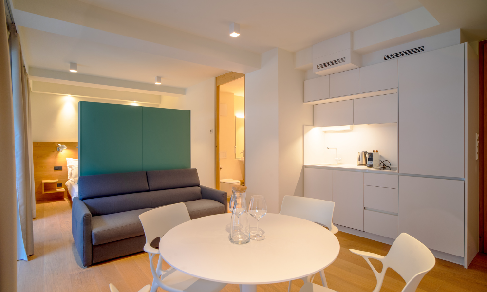 Hosts Paolo and Giulia live – together with their children and their dog – on the first floor of the completely renovated villa; they especially enjoy chatting personally with their guests. They place great emphasis on energy-efficient living that meets the latest standards: there is thus a wallbox for guests to charge their electric cars in the underground car park, super-fast fibre-optic broadband, and a keyless smart access code for flexible check-in. The five modern apartments are all ideal for relaxing on either working days or in the holidays, with no compromise when it comes to comfort: also available are E-bike hire, a gym, a roof terrace and pool with sun loungers in summer and a wellness oasis with a sauna and relaxation area – it’s all there!