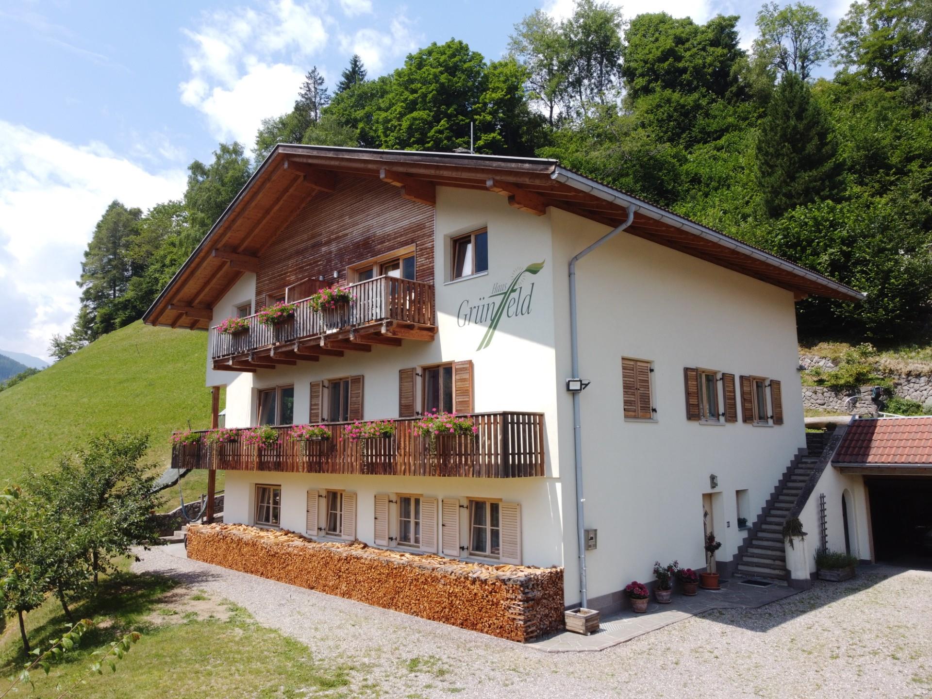 At the end of the village of Santa Valburga in the Ulten Valley stands the Haus Grünfeld, run by the Gamper family. It is approximately one kilometre from the village centre, while shops and a bus stop are just 100 metres away. The garden features comfortable seating and from the balcony can be seen the dam, part of the Zoggler reservoir, and the surrounding forests. There is plenty of parking outside the house.
