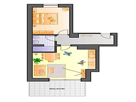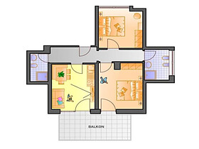 The apartment is located on the first floor and has a floor space of 68 m². The bright apartment consists of two spacious bedrooms, each with a double bed, a kitchen-diner with a wonderful view of the mountains, two bathrooms with shower/WC, bidet and washbasin, a hallway and a large balcony measuring approx. 20 m².