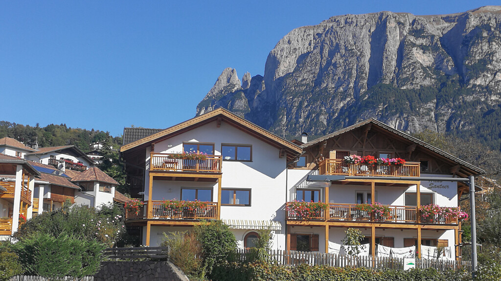 A cinque minuti a piedi a est del centro di Fiè allo Sciliar si trova, rivolta verso lo Sciliar, Casa Santner. Chi decide di trascorrere una vacanza qui non approfitta solo dei pregi della zona escursionistica senza eguali dell'Alpe di Siusi; dietro l'angolo ci sono infatti anche negozi, ristoranti e addirittura varie fermate dell'autobus che conducono all'area escursionistica e fino a Bolzano. Sotto il pergolato di vite ci si può abbandonare al riposo nello splendido giardino e ammirare il panorama sullo Sciliar, sulla Punta Santner, sulla Punta Euringer, sul Dorsale del Maglio, sul centro del paese e su Renon.