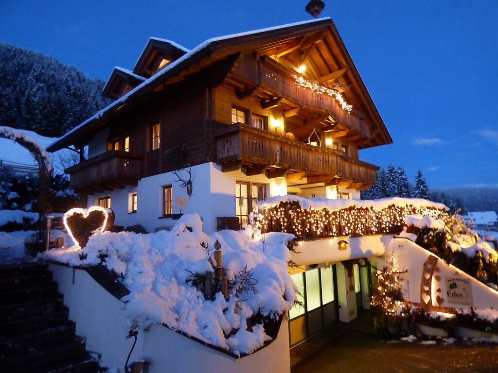 A 1,5 km dal centro di Dobbiaco sorgono, a 1.325 m di altitudine, gli Appartamenti Eden. Il loro nome è una promessa che viene mantenuta: ad aspettare gli ospiti una casa in posizione soleggiata tra prati e foreste, un ampio giardino e una vista mozzafiato sulle cime delle Dolomiti. Tappeti in lana di pecora, mobili in legno massello, pulizia a basso impatto ambientale, giardino di erbe aromatiche e convenzioni per la “Biokistl”, la cassetta di prodotti biologici dell'Alto Adige, contraddistinguono questa azienda eco-sostenibile.
